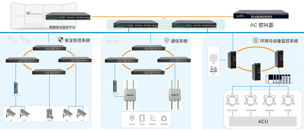 每个管廊的网络由三个环网组成:安防系统环网、通信系统环网和ACU控制环网。